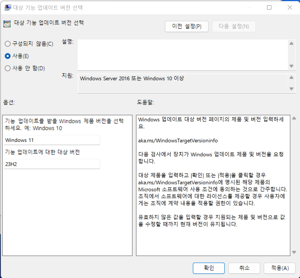 3. ์ต์ ์ '๊ตฌ์ฑ๋์ง ์์'์์ '์ฌ์ฉ'์ผ๋ก ๋ฐ๊พธ๊ณ ์ต์ ์ 'Windows 11', '23H2' ๋ฅผ ํ ์คํธ๋ก ๊ฐ์ ๋ก ๊ฐ๊ฐ ์ ๋ ฅํ๊ธฐ