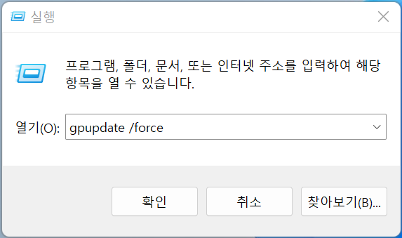 4. ๋ฐ๋ ๋ฉ๋ด๋ฅผ ํ์ธํ ํ, ์คํ์์ gpupdate /force ์ ๋ ฅ