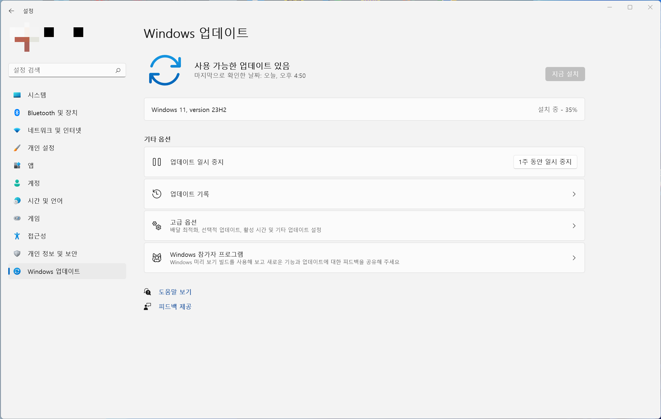 5. ์คํ ์๋ฃํ 'Windows ์ ๋ฐ์ดํธ'๋ก ๋ค์ด๊ฐ์ '์ ๋ฐ์ดํธ ํ์ธ' ๋ฒํผ ํด๋ฆญ