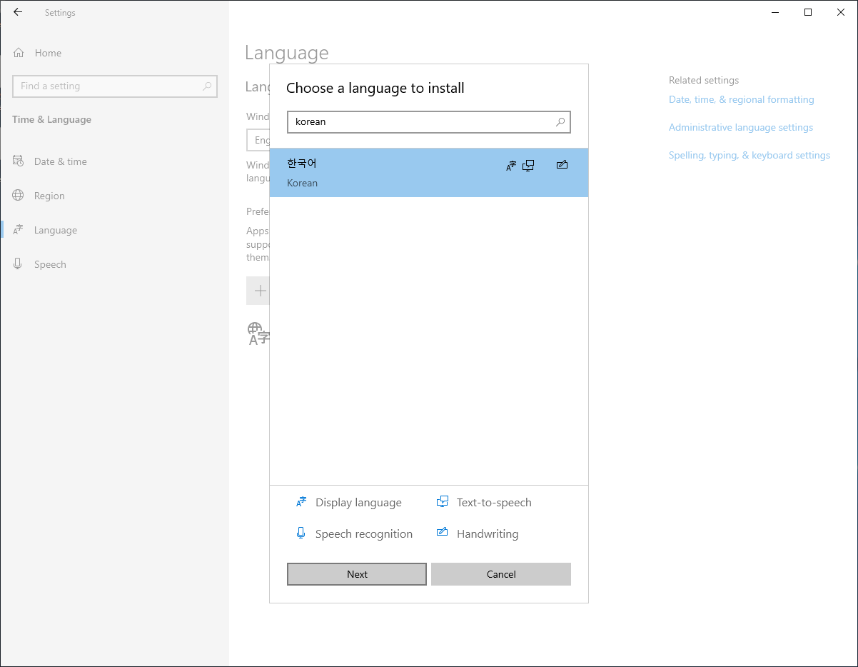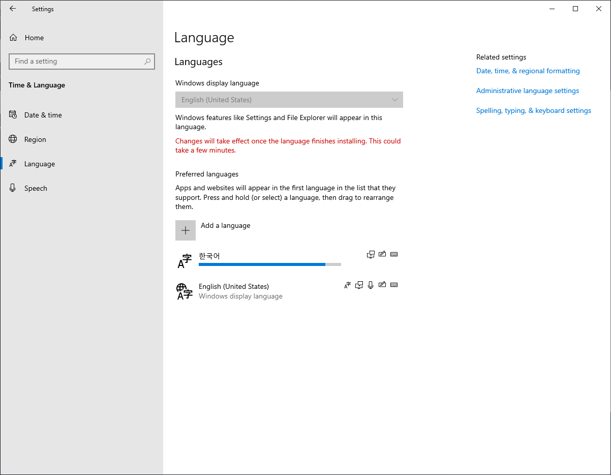 ์ค์น๊ฐ ์๋ฃ๋๋ฉด ์๋์ ๊ฐ์ด ํ๊ตญ์ด๋ก ์ ํ์ด ๊ฐ๋ฅํ๋ค. (Windows display language ๋ถ๋ถ)