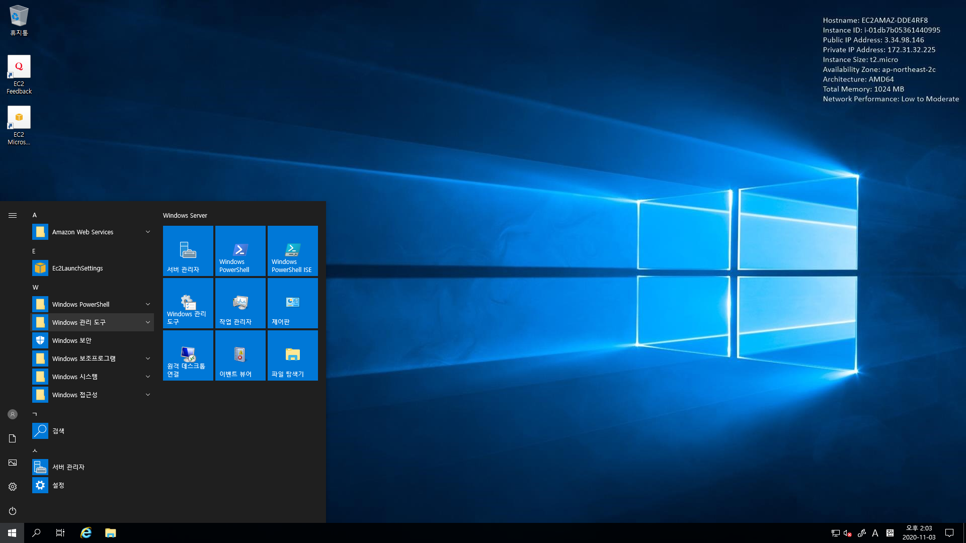 ์ฌ๋ถํ ์ ์๋ฃํ๊ณ EC2 ์ธ์คํด์ค์ ์ฌ์ ์ํ๋ฉด ์๋์ ๊ฐ์ด ์๋์ฐ๊ฐ ํ๊ธ ํ๊ฒฝ์ผ๋ก ๋ณ๊ฒฝ๋ ๊ฒ์ ๋ณผ ์ ์๋ค.