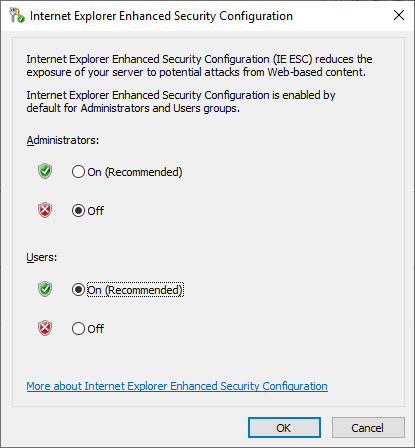 IE Enhanced Security Configuration : On ์ Off๋ก ๋ณ๊ฒฝ (์๋ ๋นจ๊ฐ์ ํ์)